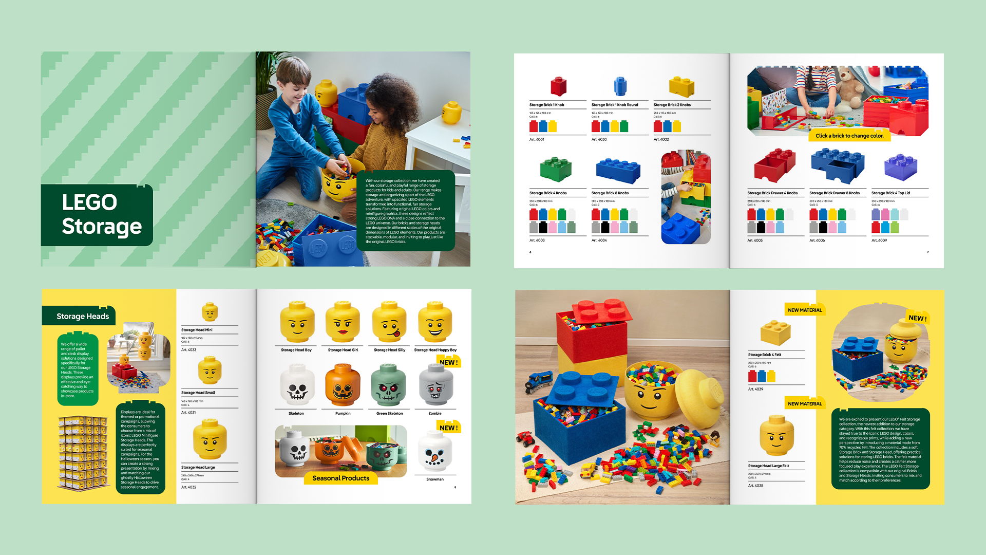 The goal was to design a catalogue that feels both playful and highly structured, reflecting LEGO’s iconic visual universe while maintaining the clarity and polish expected in a professional B2B product presentation.